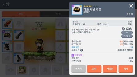PC版だと ボスダメージ30%UP、防御無視30%、ステータス9%等が付与されていた。この潜在能力が一番ステータスに影響してくるので慎重に行っていきたいが、この厳選をするには「キューブ」と言われるものでお目当ての能力が出るまで回し続けなければいけない。